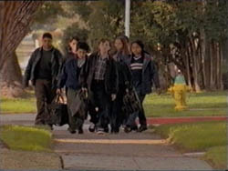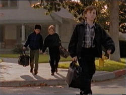 CUT BACK TO KEVIN, REACHING THE CORNER OF THE BLOCK. MORE KIDS WITH BAGS JOIN HIM.