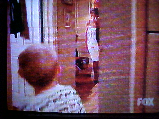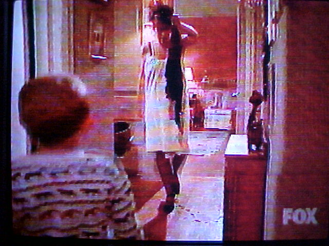 I caught this the 1st time I watched this episode. Right after Dewey yells "I'm Telling" (cause he couldn't put the bow on Hal & Lois' present), he gets up from the table yelling "MMMMMOOOOOMMMMMM!!!!!!". Lois meets him in the hallway holding her soaking and burned dress, and Dewey turns back towards the kitchen screaming "NNNOOOO!!!!!!". When they meet in the hallway, if you look closley, there's a man with a bucket on the floor to the left of Lois. Apparently, that's where the wet dress was being stored in between takes. These pics aren't the best quality, I know, but I tried. It's hard taking a pic of the TV with a digital camera.