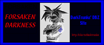 Welcome to the realm of Forsaken Darkness. I am DarkTrunks. Here, we do not believe in tampering with anime when it reaches North America. Anime is an art form, and should be left that way. Although Gogeta689 is my inferior rival, he did teach me HTML (His first mistake) so I owe it to him to post his sites: Zelda64 Realm, Gogeta 689's DBZ site, Bulbasaur's Pokemon site.