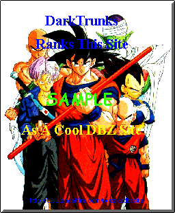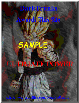 Welcome! Here you can try to one of my awards! Below are samples of the awards that you can win. The qualifications are not meant to say that you MUST have those things, they are merely tips and what might help you win. The only two things that you must do are: Have a Dragonball Z page, and make the award a link to my site. If I choose you from random without you applying, you do not have to make it a link. However it is more likely you will win if you apply in my guestbook. Leave me your email address so I can contact you. (you can make it a private message if you want) They have the word "sample" over them so cheaters cannot just save them and put them on their site without winning them. The real ones won't have the word "sample" on them.