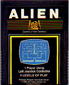 Alien, like many games for the Atari 2600, was very similar to the game Pac-Man. The game was very loosely based on the movie Alien. Your goal in the game is to stomp on all of the alien eggs on each level. If you grab a pulsar, you can then destroy the aliens by touching them (very similar to the power ups in Pac-Man). Unlike Pac-Man, in Alien you get a flame thrower. Just imagine Pac-Man with a flame thrower...that sure would have been an interesting spin on the game! In addition to the Pac-Man like boards of Alien, you have bonus boards between each regular board. On the bonus boards, your goal is to run from the bottom of the board to the top of the board through lines of aliens which move either left to right or right to left. This is very similar to the game Frogger, but you can only move up and down, not right or left. I guess that makes it more like the Activision game Freeway. Overall, Alien is a pretty fun game to play! I like it better than the Atari 2600 version of Pac-Man anyway. Alien is a bit more difficult to find than your average game, but you can still pick up a copy for under $10. |