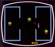 "The Astro Date is 3200 and you are the last survivor of a group of earth people who came to explore the planet Mazeon. Soon after landing, you discovered the planet is a dark, apparently uninhabitable place. But by then it was too late to turn back because your space craft had been destroyed by Automazeons. Now you are a prisoner here. You are trapped in a maze where even the walls are death to touch. Grim robot thugs known as "Automazeons" stalk you relentlessly and you must systematically pulverize them with your laser gun before they eliminate you with theirs." You can move your character up, down, left, right and vertically. You can also shoot in all of those directions. Your goal is to shoot as many robots as possible without touching anything. If you are shot, if you touch a robot or if you touch a wall...you die. You score 50 points for every robot that you shoot. If all of the robots are destroyed before you leave the room and move to the next room, you get a bonus of 10 points for each robot that was in the room when you entered. In some game variations of the game, you also must face a giant smiley face called "Evil Otto". You can not kill Evil Otto, but on some game variations, you can shoot him and make him start back from the edge of the screen; other game variations, you just have to outrun him. Some game variations you get extra lives every 1000 points. Some game variations you get extra lives every 2000 points and some have no extra lives. Berzerk was a very popular game when it came out and there are a lot of copies out there. You should have no trouble finding it at a very low price. |