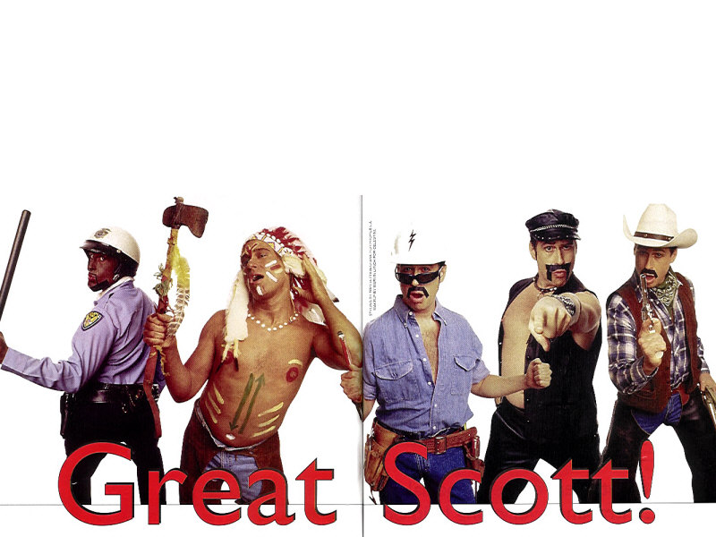 Great Scott! Scott dressed as all the village people on a stunning white background.