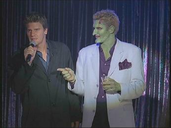 And at Caritas, presenting, Angel The Vampire with Soul!!! "Oh, Mandy. Well, you came and you gave without takin.' And I sent you away . . ." Angel looks as pained as those watching him belt out an off-key version of the Barry Manilow tune. He finishes, and the MC pulls him aside and starts to read him: Angel made an honest mistake, he says, but things don't look too good for the mother. After Angel admits he chose to sing "Mandy" because he thought it was pretty he gets the location: 4th and Spring.