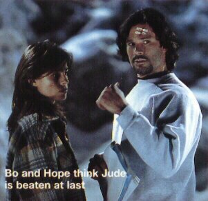 Hope is missing Sending out a search party - they needed all the held they could get. Bo promised Shawn Douglas he would find his mother and they would be a family again. While Jack promised to find Jude St Clair to prove to Jennifer that Peter was the bad guy he thought he was all along. Hope is found by Bo but Jude St Clair has other ideas Finally they were able to get a clear shot of Jude St Clair and in an instant he was dead. Problem was, the one who shot him was the one who had to prevent him from telling everyone he was a crook. Who? Peter Blake, of course. Bo might be badly injured but he's finally back together with Hope |