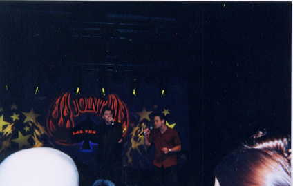 They opened the show with Questions Only: Greg asked for a place where people might meet. Someone said Las Vegas. Greg looked at her and said, Las Vegas? Well what a creative and fruitful imagination you have! So they set the scene in Las Vegas. All I remember was Ryan stepping forward next to Colin and asking, Think those are real? and then, If I stick a pin in her, you think shell go flying across the room? I also have a picture of Brad and Colin doing a Questions scene together, in which I think Colin was the entertainment. He looks like hes holding a microphone and singing, which Im sure was funny.