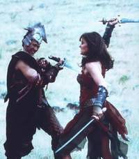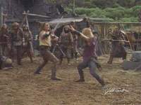 Mientras tanto, de vuelta en el campamento, la Malvada Xena entrena a sus hombres para que cumplan su plan de matar al Hercules. Les da una tunda a todos y los llama patéticos. Qué mujer. Sin lugar a dudas, ellos piden más.