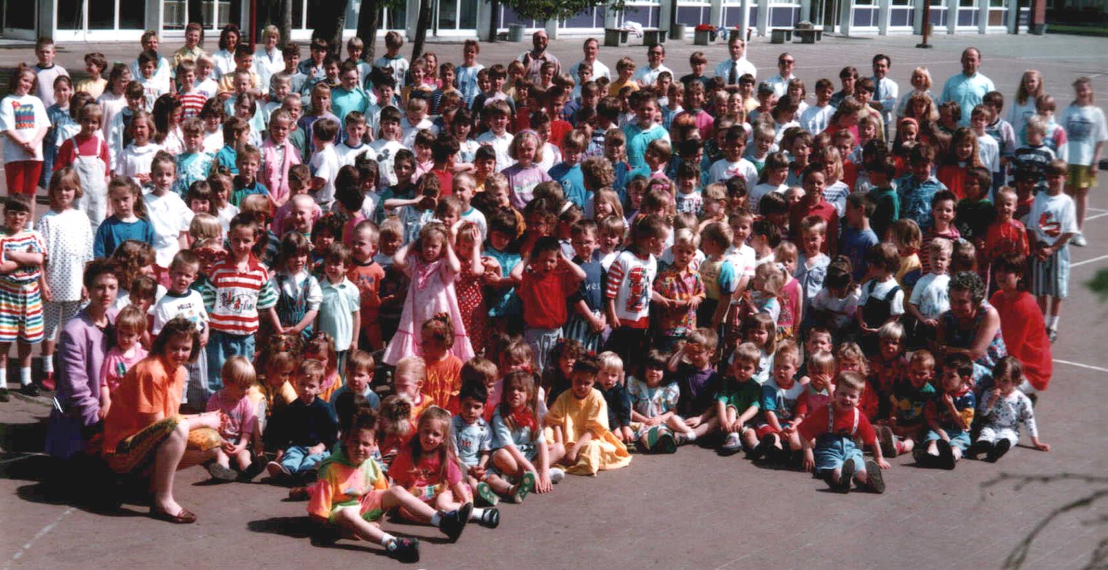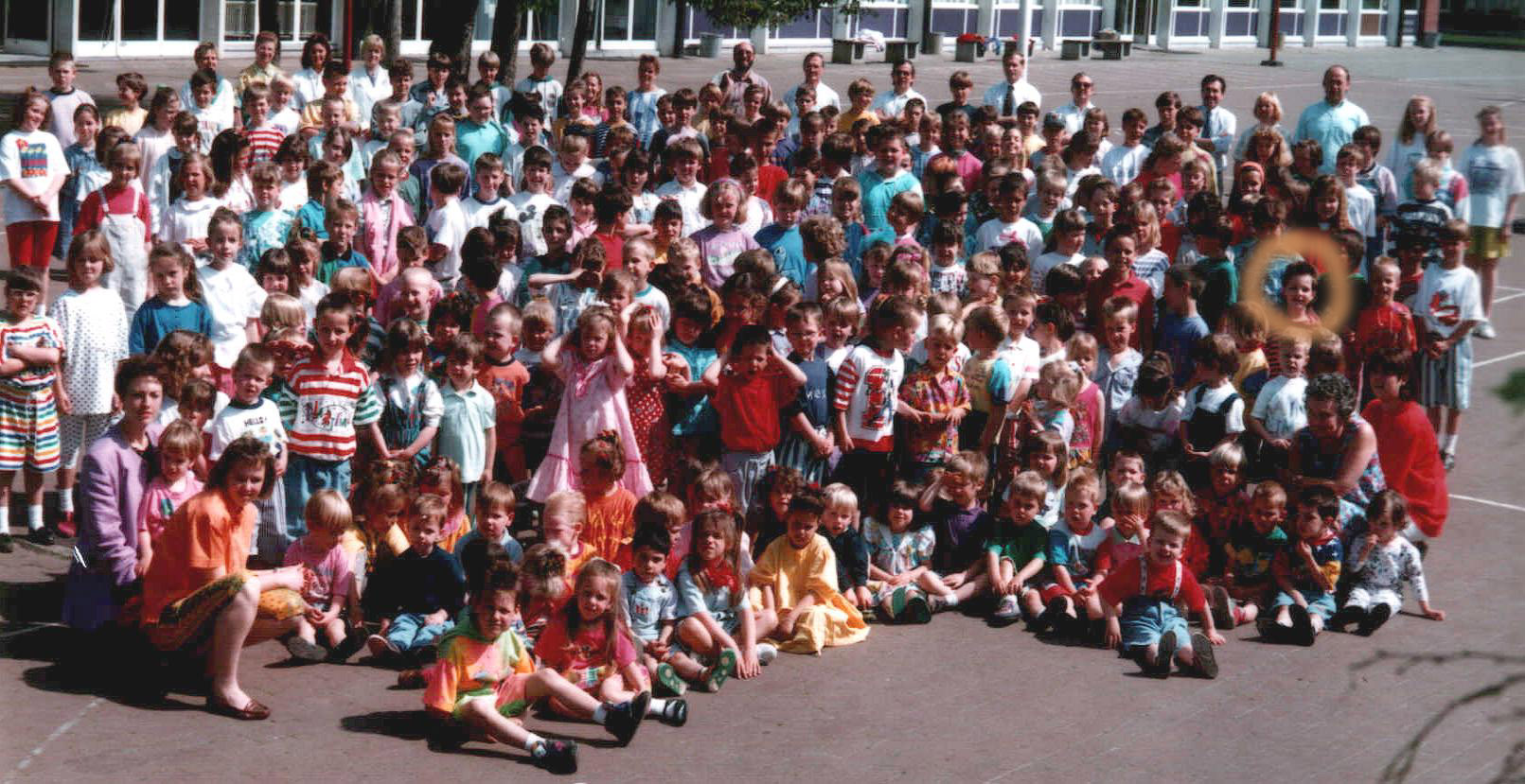 jongen naast de jongen op de eerste rij met zijn rood t-shirt en bretellen"