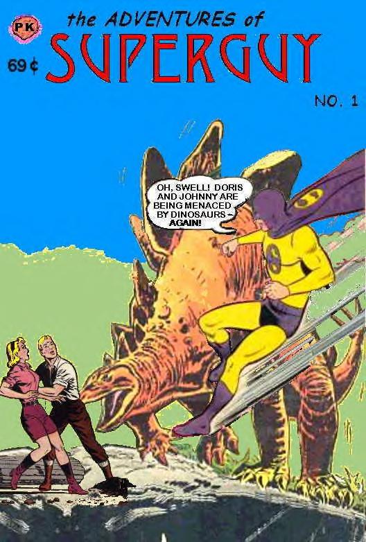 Using his astonishing vision powers, Kent looked in the direction of the sound, and quickly located the source. Johnny, along with fellow reporter Doris Dane, was on a plateau in Africa, being menaced by a stegosaurus that hadn't got the memo about extinction. Quickly Kent sprang from his chair and hurried into the men's room for a quick change. The room was empty except for editor Barry Dwight and the newest copy boy, who were occupied in the same stall. Ignoring them, Kent whipped off his street clothes to reveal the garish purple and yellow costume of Superguy. Springing out the window, he hurled his amazing body toward darkest Africa.
