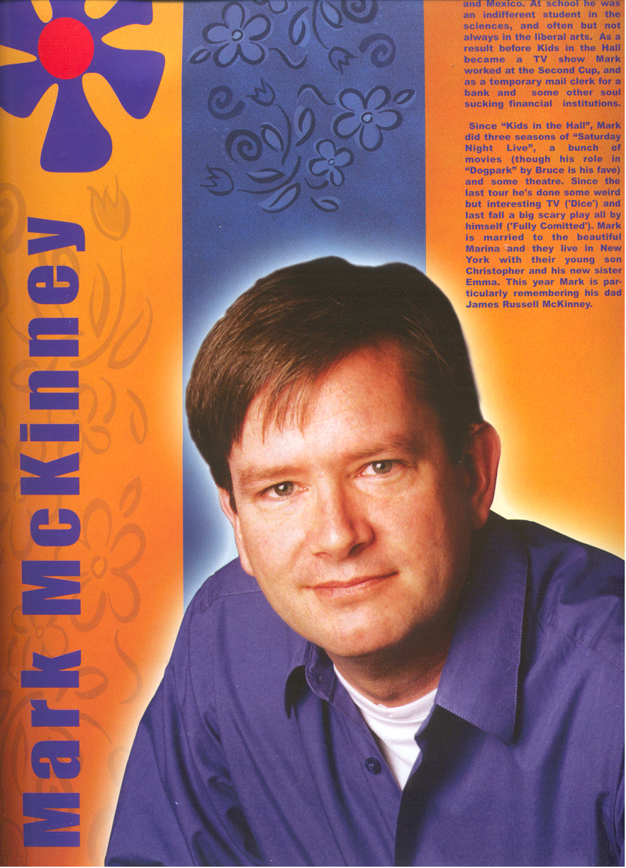 It was all so amazing I don't even know where to start. I still can't believe I saw the Kids In The Hall live! There they were, all five of them, real as anything, standing on stage. I just sat there, ten rows back, mind you! The most amazing seats ever! Holy shit! They were fucking fantastic! I screamed and spazed and proceded to totally lose my voice. I was already sick, but that totally did it in. The show was hilarious. I thought I was going to piss my pants. I didn't go after we went to eat, and we were going to be late if we stopped to go, so dammit, I held it! I'm glad I have a strong bladder. ;) The best parts had to be when they screwed up and started laughing at eachother...the best part of the show that is...but what will always stick in my mind was afterwards! Obviously! I said very firmly to my aunt and my friend, "I'm styaing." My aunt and Molly were freezing and so was I and it was starting to rain but we stood on this platform by the river behind the theater with a group of about 25 or so other people waiting for the Kids to come out. First Kevin came out. A gaurd right away ushered him away from us! I couldn't get his autograph or a pic. or anything and he was the one I really wanted to meet. Crap! But as he was leaving I yell "Bye Kevin! We love you!" And he turns around to the group, waves and says "Bye!" He's adorable. I love him.