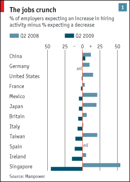 An economic collapse on this scale is bound to hit jobs hard. In its latest quarterly survey Manpower, an employment-services firm, finds that in 23 of the 33 countries it covers, companies hiring intentions are the weakest on record (see chart 1). Because changes in unemployment lag behind those in output, jobless rates would rise further even if economies stopped contracting today. But there is little hope of that. And several features of this recession look especially harmful.