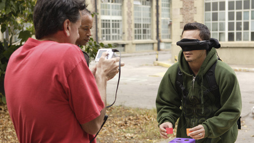 The "young at heart" players will be wearing Myvu goggles, which are hooked up to cameras that will be run by their teammates. What it boils down to is that Paul and Craig will only be able to see what Mark and Nicole show them, and since it's a mirrored image, it will be backwards. Mark and Nicole, as the camera operators, are not permitted to speak during the mission.