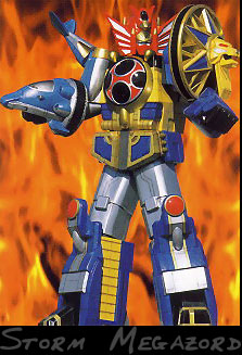 The Storm Megazord is the first Megazord, used by the Red, Blue, and Yellow Rangers. Lightning Mode (not pictured) is a feature which allows the Zord to become faster and more powerful, although it lasts for only sixty seconds.