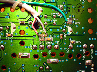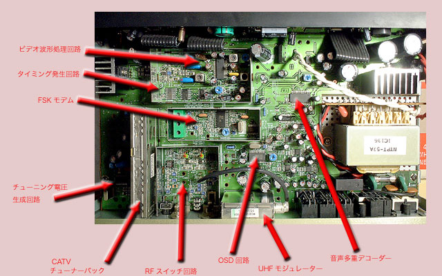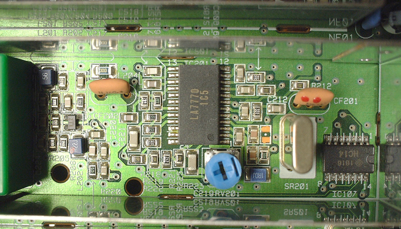100MHz以下の帯域を使って送出局側から機器を個別に制御できるようにPSKモデムが搭載されています。この機種の場合下り方向の通信のみなので簡単な回路です。 このモデムを使用した通信により契約チャンネルのセットアップや周波数のプリセットが行われ、契約終了後の抹殺処理もこのモデムを通して行われます。 ということは、この機能を破壊するとずっと有効なままになるのかも知れません?、気休めですが友人に返却するときに受信データのマイコンとの通信線をカットしておいてあげました。