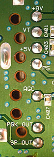 下の画像はチューナーユニットの裏側、上から+9V電源、チューニング用電圧、+5V電源、電源、AGC、モデム用PSK出力 そしてSP出力ピン。