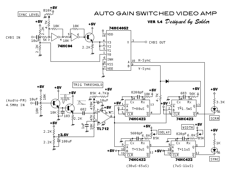 簡単に回路と調整方法の解説をします。回路上段が同期圧縮されたビデオ信号を2倍に増幅するためのHC04と通常の映像部分とを切り替えるアナログスイッチの4052です。 同期信号部分はややオフセットさせる必要があったのでSYNC-LEVEL(5kΩ)の半固定抵抗で同期信号の底と映像波形の相対関係を調整します。ところでこのHC04をアナログでビデオアンプ動作させているというかなり変態な? 回路ですが、出てくる絵をみる限り高価なビデオアンプを使わなくとも同期するためだけに必要みたいなものゆえ、極端に高画質を目指すのでなければあまし問題ないレベルです(爆)