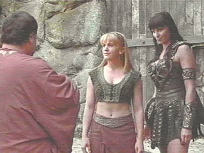 Xena obviously doesn't like to shop...my kind of girl! The merchant Gabrielle haggles with is the croupier from King Con. Gabs is a professional when it comes to haggling...nice job! But what is she going to do with that piece of cloth she bought? It's pretty obvious there's something wrong with Xena's eyes as soon as the oil hits them. She starts blinking very hard and rubbing at them...even to the point that she lowers her sword briefly. That was a pretty good fight with Palemon. Xena's confusion over the pinch is great...her utter confidence turns to confusion when Palemon won't give in. Palemon asks, "So, who is this Gabrielle, anyway?" AFTER he kidnaps her! Xena comments, "You kidnapped Gabrielle for money?" She sounds shocked or maybe even appalled by that. Wouldn't that have been the most obvious reason? Check out the sound of the locusts in the background during that scene...sounds like Southern Indiana! Gabrielle describes the king as "incredibly handsome", but uh...her eyes never travelled far enough up his body to see his face. She seems fascinated by other regions. Wow, even blind, Xena kicks serious ass! I'll bet Palemon wouldn't have been so cool if he had known Xena couldn't see when she kicked the sword at him to free him! Gabs must have had an awful lot of sheets on her bed to make such a long rope! Gabbers calls Xena "My best firend, Xena: Warrior Princess." Gabs? Husky? No way! And Thrace and Macedonia is "backwoods"? Gabrielle has peasant muscles and diswhater hands? I don't happen to agree with Vidalis on any of those issues. Gabrielle refers to herself as a "complete peasant stranger", and after a beat realizes what she has just said about herself. It's said when someone loses a sense, the other senses become heightened to make up for it. Xena's supersonic hearing is more incredible than ever before in this one. I love Xena's wry, "Well, not the horses themselves." When Xena first whirls on Palemon in the woods, she is looking directly at him, as if she could plainly see him. "Lady Gabrielle" doesn't look very comfortable in her new duds! I would have thought she could have handled those shoes a little easier, but I guess Xena's the one with the incredible sense of balance. Why did Vidalis chose that hairstyle? It's attrocious! Is this episodes supposed to be a comedy? When the toast is being raised to the future queen, check out the background voices. One of them is saying, "To many healthy children." I kinda like it when Xena goes running off the edge of the cliff. I got a brief impression of Wile E. Coyote doing the same thing. She sure finds that very small keyhold in the manacle easy enough! Why does it have to look so fake when she's falling over the cliff? You'd think by now Hollywood would come up with better special effects. She fell for way too long a period of time to be within such a short distance of Palemon, but I know, I know, it's the Xenaverse physics. Gabrielle appears graceful enough to me. I do like the scrolls on the head though! My fair Gabrielle. Note the sex of Vidalis's "certain someone" is not given. But Gabrielle refers to her special someone as a "him". I love Xena's line, "And I'm the one who's supposed to be blind" in reference to Palemon. Gabs is sitting there holding a dead king's hand...no wonder it's cold! I love her exclamation, "Sweet mother of Zeus!" Hee hee! Pretty cool the way Xena is able to catch the chakram by sound alone! Palemon doesn't have many friends, because they make a person weak. "Oh, is that why?" Xena quips. Xena killed Krakus at Pilon...figures. "Be careful, Palemon, we all eventually become what we pretend we are." Oh, how I wish that was true! Palemon's upper ear clip seems way ahead of its time. Poor Gabs...what a wedding! Gabrielle was looking for a sign from Mt. Olympus, when the minister called for it, but none came, darn it! And I love it when Gabs growls at the bad guy! Wonder who she learned that from? That casket scenario is just bizarre. And a crematorium reminds me too much of the Holocaust. "It's beginning to sound as though you might care." This line from Xena bothers me...it's too formal. I like Vidalis's offhanded, "Leather, huh? Bold choice." Vidalis is played by the same actor who played the merchant in Dreamworker. Xena kind of tips off the fact that she's blind when she enters the crematorium and says, "Where's Gabrielle?" When she gets ready for the final fight, her actions are too "sighted." I could imagine she would be good from instinct, but don't think she would be that good that quickly. It would take a while to adjust. And youda thought Xena could have heard Gabs in the casket, with that bionic hearing of hers. "Out of my way, Fishcake." This line was delivered to Vidalis. Should it have been "fruitcake"? Palemon was choked up by the reunion of Xena and Gabs. Imagine he would have handled a scene like Is There a Doctor in the House? or The Quest! Gabs tells Xena it might sting a little bit when she pours the solution into Xena's eyes. Why would she bother to tell Xena? Xena handles pain every day! The antidote sure worked fast! "Now there's a sight for sore eyes..." I saw that one (pun intended) coming a mile away! Vidalis as Palemon's sidekick? Nahhhh! Gabs says sidekicking is good work if you can find it. I wish she'd make up her mind! It's so funny seeing Xena do a curtsy, especially in her "working" clothes. And what's up with "Oh yeah...two hands...check it out." She must be feeling mighty good! Palemon's character and his relationship with Xena was the most interesting factor of this episode, in my opinion. I would have liked to have seen Palemon turn up in a later episode, as he was a character with a lot of spirit. And Gary says: Okay...this episode was good in parts,and I generally liked Gabby's situation rather than Xena's. In town,Gabby does a little shopping,and ends up with a shawl. The bad guy,Palemon,kidnaps Gabby and tells Xena that he killed her. This is to ensure that