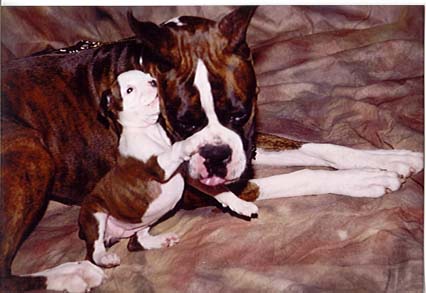 Missy does not understand that she is so small. She even takes on Doc who is patient with her. Doc will play for hours with Missy and never once hurt her. Only in a boxers heart can you find such love. |