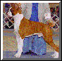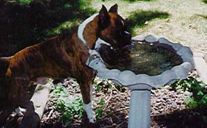 I made the decision to purchase a show male and Khan came to live with me. (You can meet him on another page). Imagine my surprise when several months after bringing Khan home, I received a phone call from a vet who said that my missing boxer had been found. When I went over to the vets, an assistant went into the back to bring out the boxer. She was gone a few minutes and then there was my Chips head comming around the corner. He actually pulled the assistent off her feet to get to me. He was covered with fleas, had some open wounds and turned up heartworm positive, but he was home.