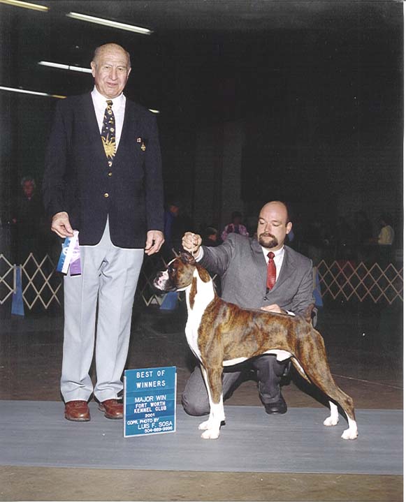 Doc is shown here taking his first points at 18 months of age. It was a four point major and I was very excited. He was handled beautifully by Michael Shepherd. Michael will soon have Doc out in anticipation of completing his championship. He is still a young dog and still needs some maturing time.