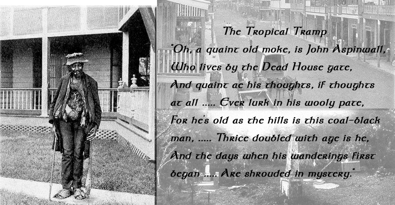 The Tropical Tramp .... Colon. From "Panama in Picture and Prose" by Willis J. Abbot ©1913. "One of the figures long pointed out on the streets of Colon was an old colored man - who had been there from the days of the alligators and the monkeys. He worked for the Panama Railroad surveyors, the road when complete, the French and the American Canal builders. A sense of long and veteran public service had invested him with an air of dignity rather out of harmony with his raiment. "John Aspinwall" they called him, because Aspinwall was for a time the name of the most regal significance on the island. The Poet of Panama immortalized him in verse as seen in the above picture.