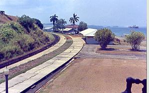 The train station, looking down the track towards the Aids to Navigation bldg., and the Gatun Lake.