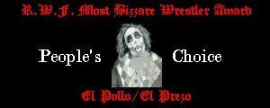 | Druid got this award from me for alot of reasons. Alot of you guys never seen him in interviews, promos, or even in the ring. This guy was fuckin nuts. He drank 2 day old glasses of warm curdy milk. He lived in a cave type area, he called the asylum. He was always trying to get people to join..but how can you follow a loony bastard like this guy. He really was a loner for a long time, in a place where loners just don't survive. You've got to respect for this crazy fuck...because he even won the World Title before dissapearing into the dark. He moved on to lead the Wolfpac and became a destructive force, but was never really normal. He had a hatred for Marcus Alen(Not many people didn't) that eventually drove Alen out. Druid was a great wrestler, and a great part of the R.W.F. | El Pollo was a people's choice for alot of reasons. Not only when he began did he come out dressed up like a chicken, but he talked of perverted things..and of living in chicken shit. Not to mention the guy lived in the R.W.F. Bathroom. What can you say about that? He went on to get dropped on his head, and completely turn into El Prezo. This was one of the greatest creations in R.W.F. History. He went around yelling at people, telling them they're fired..and even winning the Intercontinental Title, and joining the Illinois Nazi's despite the fact that he was Mexican. He actually tried to fight Dav Pinnick for power of the Robo Wrestling Federation, and won a match letting book the entire next card. Which he did. He had alot of crazy matches, but I have to say having 2 men fight in a Taco Bell with suits of armor on was the craziest. How can you not think this guy is bizzare? |