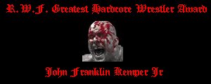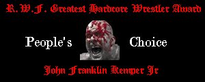 | Another Unanimous decision. John Franklin Kemper Jr. deserves this award as much as anybody deserves any award. In an amazingly close vote, John Franklin Kemper Jr pulled out the People's Choice award over Eddie Kruger. He also got my vote on most Hardcore. Alot of you will wonder why with this, I'm sure. This is not for reasons, most of you are thinking. I did not choose J.F.K. over Eddie, because of their win/loss record against each other. Also, not because I feel that J.F.K. won that feud. I picked him simply because he wrestled hardcore with everyone. Kruger had some good feuds, but really he's known hardcore for his feud with J.F.K. J.F.K. is known for HARDCORE feuds with everyone. He had a great feud with Puss, that lead to the infamous Greenhouse match which ended in a double knockout after both of their heads when through the top of the Greenhouse. He made Mick Foley looks like Mary Poppins...Mick would've looked at the Puss/JFK greenhouse match and would've said. Man, this guys fuckin nuts. Or perhaps J.F.K.'s feud with the man who brought him into the R.W.F. as the "Patient" Dr. Mangahaus. They had some great ones, including the match that ended J.F.K.'s career and more importantly his life. J.F.K. feuded went hardcore badass on anyone and everyone who crossed his path. He never once backed down from a fight, and never once listened to a doctor tell him to quit wrestling. He was one half of Salt'n'Pepa which you read about in the Awards also. This tag team destroyed all and never lost a match. J.F.K. was also Dav's Personal bodyguard for a long time. Where he went to all costs to destroy anything that tried to hurt Dav, he did very well at that. He took beatings for protecting Dav, but always got up and got Dav out of there. John Kemper Jr. was a badass, an extreme badass whos hardcore skills cannot be disputed. He will always be remembered as a badass, not to mention a helluva wrestler. He respected the sport, and had alot of honor. He really pushed a new style into the R.W.F. that we will never forget. His great matches will be remembered by people in this fed, long after everythings said and done. His demented mind will always seemingly strike people as crazy, but he live and even died..doing what he loved to do. For J.F.K. there's only one way to explain his career. He came...He saw...He kicked some serious FUCKIN ass!!!! |