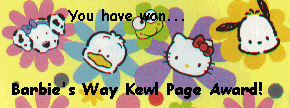 Congratulations!!! You have won Barbie's Way Kewl Page Award!! Your page is really great!!! You have done a super duper good great awesome kewl job! Keep up the great work!