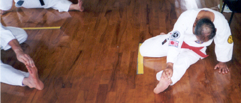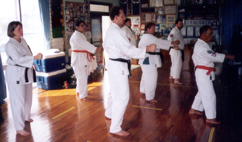 Master Uezu lead us through warm ups, basics, kata and bunkai. Hanshi Uezu has a lot of stamina and proved it daily.