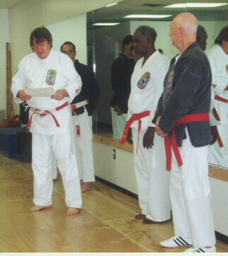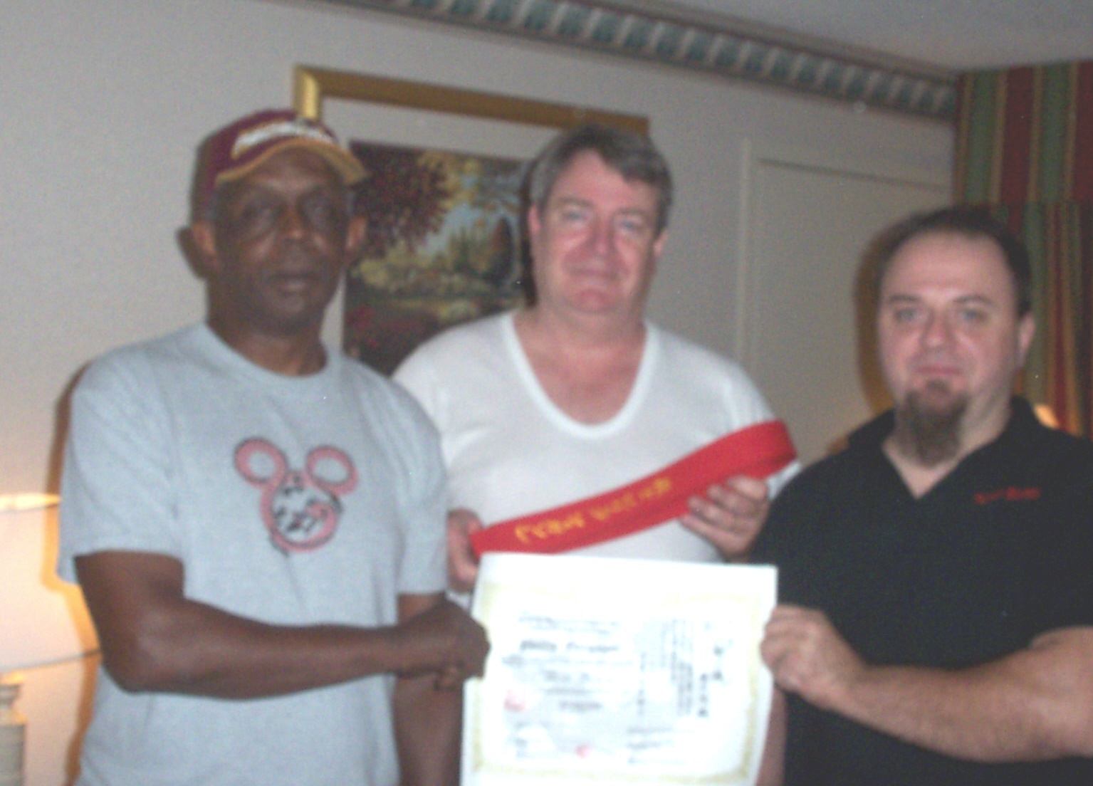 This photo was taken in my hotel room on September 22, 2007. Grandmaster Washington, Ju-Dan is on my right, I am in the center and Renshi Munoz is to my left. I also received a Ku-Dan certificate from Grandmaster Ed McGrath.