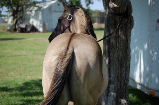 Shade was purchased November 2003 as a yearling. She was never registered as foal but her sire is Remmingtons Pride (APHA) by The Hot Shot Starr (APHA) who is by the Famous Hot Scotch Man (APHA).