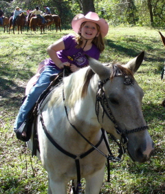 Year after year, the kids ride her on Salt Grass as well as local trail rides. Laura is now 7 and can go get Sunday out of the pen, take her over to the trailer, climb up on her bareback and ride around the yard without any help.