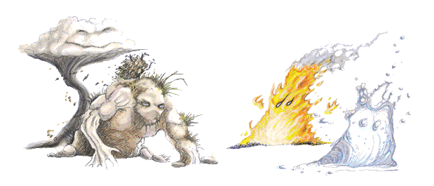 Elementals are sentient beings that can possess bodies made of one of the four basic elements that make up the Prime Material plane -- air, earth, fire, or water. They normally reside on an elemental Inner Plane and will only be encountered on the Prime Material plane if they are summoned by magical means. Each elemental must adopt a shell in the Prime Material composed of the basic element it represents, and once this shell is destroyed, the elemental will return to its native plane. While there are many more powerful and more intelligent residents of the elemental planes, the common elemental is the easiest to contact, and therefore the most frequently summoned. Their magical nature gives elementals great protection from attacks on the Prime Material plane. Elementals are not harmed by any nonmagical weapons or magical weapons of less than the finest enchantment. Though elementals do enjoy protection from many nonmagical attacks in the Prime Material plane, like all extraplanar and conjured creatures, elementals are affected by protection from evil spells. An elemental cannot strike a creature protected by this spell and must recoil from the spell's boundaries. However, the elemental can attack creatures protected by the spell as long as it doesn't touch them. For example, a fire elemental could set the ground on fire around the creature and wait for the blaze to spread. Each of the four types of common elemental has its own particular strengths and weaknesses, attack modes and method of movement, depending on its plane of origin. All common elementals share one major characteristic, however. They are basically stupid. This low intelligence makes it difficult for the elemental to resist a magical summons. But even the common elemental is bright enough to know it does not like being taken off of its home plane and held in the Prime Material plane. There are three basic ways to call an elemental to this plane, and the strength of the conjured elemental depends on the method used to summon it: by spell, staff, or summoning device. Obviously, the type of wizard or priest spell used to contact an elemental will greatly effect the size of the creature on this plane. Each individual's use of any spell, staff, or device in contacting the elemental planes produces a unique call. This unique summons will only be answered by the inhabitants of a particular plane once per day. Therefore, each of the methods of summoning elementals -- spell, device, and staff -- can be used by one person to call only one of any specific type of common elemental per day. If a staff is used four times in one day, for example, all four types of elementals must be called once. The only exception to this is an individual using more than one method to call elementals. Then, the conjurer can call a number of elementals of the same type equal to the number of methods he or she uses. This means a person with a device and a staff can summon two earth elementals. However, a person with two staffs can still summon only one elemental of any specific type in one day. Because the elemental will be furious at being summoned to this plane, concentration in conjuring the creature is vital. In calling an elemental, a person must remain perfectly still and focus all of his attention on controlling the being. Any distraction to the summoner, either mental or physical, will result in a failure to control the elemental when it arrives on the Prime Material plane. Elementals that are uncontrolled and acting upon their own desires are called free-willed. If a group is lucky, a free-willed elemental will immediately return to its plane. However, this occurs only a quarter of the time. In most cases, an uncontrolled elemental will immediately attack the person or party who conjured it, also destroying anything that stands between it and its enemies. There is no way to gain control of the elemental once it is lost, and there is nothing the objects of the elemental's wrath can do but defend themselves. The elemental's intense dislike of being away from its home plane is the only safeguard those conjuring an elemental can rely upon if the elemental runs wild. Because remaining on the Prime Material plane is painful to any common elemental, the uncontrolled elemental will always return to its plane of origin three turns after control is lost, whether it has destroyed the creatures responsible for calling it away from its elemental abode or not. There is always a slim chance that an elemental in the Prime Material will break control and attack the person who summoned it. Also, if a person is wounded, killed, or loses concentration while controlling an elemental, the creature will become free-willed. The elemental will first attack the person who summoned it and then destroy any living thing it can find after control is lost. The creature will then return to its home in the Inner Planes. A free-willed elemental can be sent to its home plane if a dismissal spell is cast upon it, but there is only a fifty percent chance of success for the spell in this situation. A successfully controlled elemental will stay on the Prime Material only for the duration of the spell that summoned it, and it can be controlled from a distance up to thrity yards per level of the person who summoned it. If under control, an elemental can be dismissed by the summoner when its task is complete. Control of a conjured elemental can be stolen from the person who summoned it by casting dispel magic specifically at the magical control over the creature (not the elemental itself or the person controlling it). Most of the normal rules for dispelling magic apply. If control of the elemental is stolen, the creature will follow the wishes of the new person controlling it as if he or she summoned it in the first place. If the dispel magic fails, the elemental will immediately be strengthened to its maximum health and the conjurer's ability to control the elemental will be greatly enha