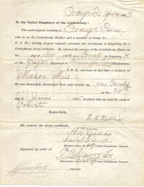 KELLIS, L. C. REVEREND, (Plot 2; Evergreen Cemetery), Born: November 03, 1846. Deceased: August 22, 1903. Enlisted in the service of the Confederate States of America, in November, 1864 and served “Honorably”, as a “Private” in Company “H”, “Yeager’s Regiment” “Mississippi Cavalry”, C.S.A. He was at his time of enlistment a resident of Macon, Mississippi. He was “Honorably” discharged from said Confederate service on the 20th day of June, 1865, by “Parole”. At which time he held the rank of “Private”. (Obtained from “Southern Cross of Honor” application…his writing).