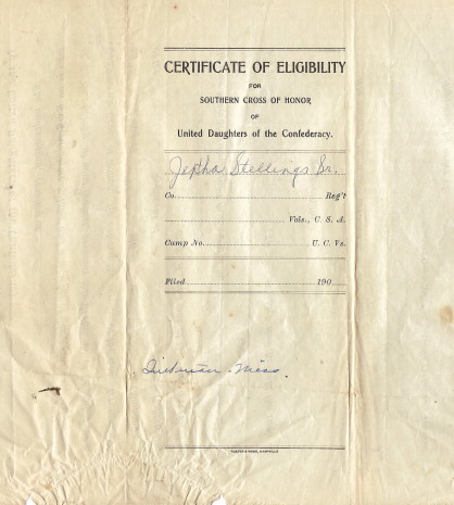 STELLINGS, JEPTHA SR., enlisted in the service of the Confederate States of America in November, 1863, and served “Honorably” as a “Private” in “Turner’s Battery of Light Artillery, C.S.A. He was at his time of enlistment a resident of Quitman, Mississippi. He was “Honorably” discharged from said Confederate service May 20, 1865, by “Captain” Turner. At which time he held the rank of “Private”. (Obtained from “Southern Cross of Honor” application…his writing).