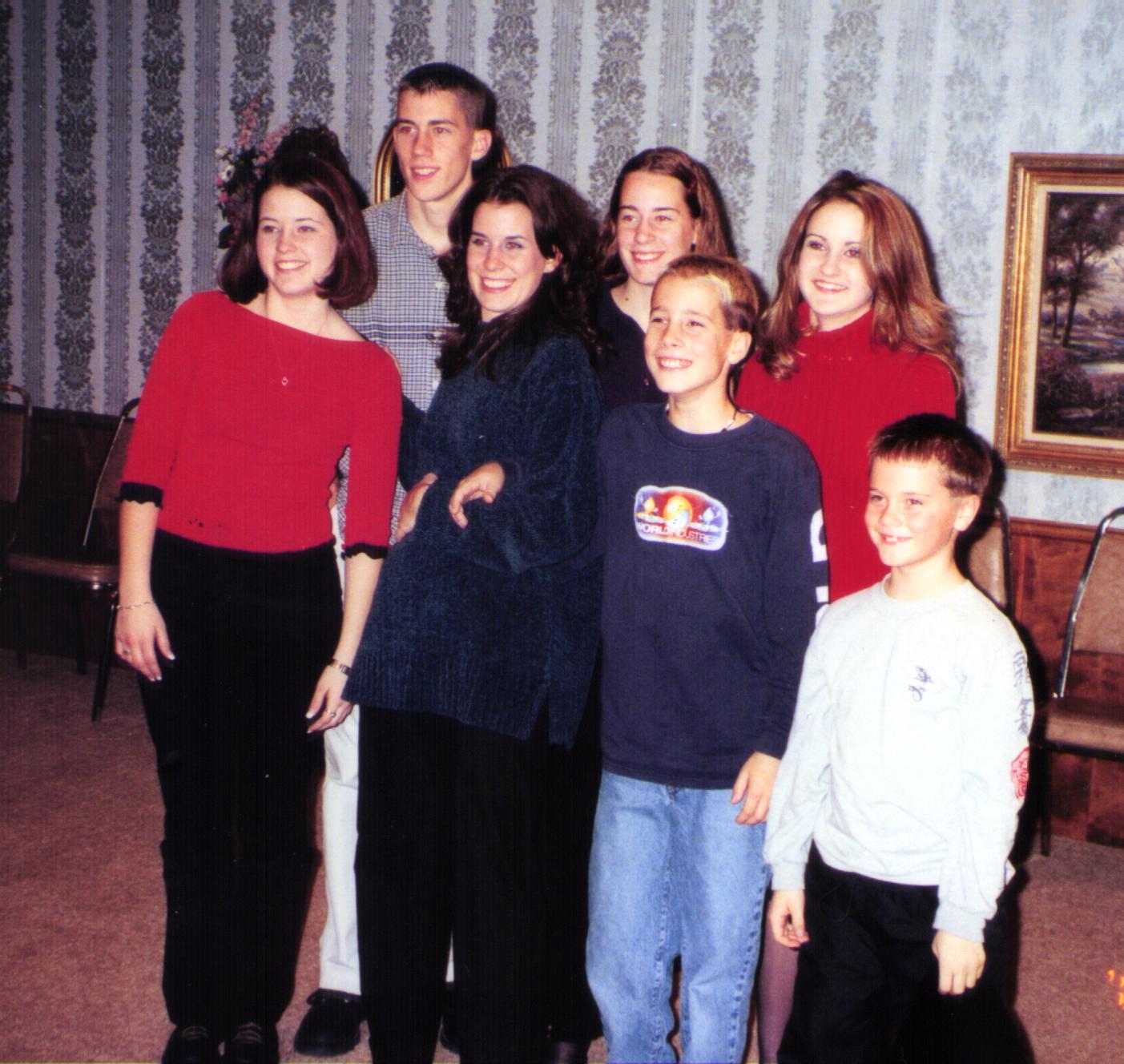 This picture is of my cousins, my two sisters, and me at my grandparents 50th anniversary party (from my dads side). From left is Rachael, me, Morgan (my older sister), Marci (my younger sister), Evan, Dani, and Drew. Rachael and Dani are sisters, and Evan and Drew are brothers.