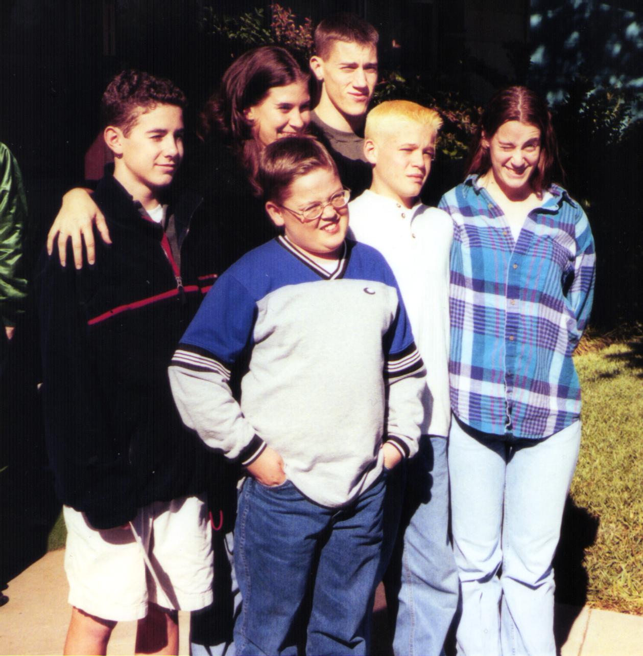 This is a picture of the cousins on my mothers side. It was taken during the Thanksgiving holidays. From the right is Nick, Morgan, Adam, me, Scott, and Marci. Not pictured are, Natalie, Karli and Randy. Natalie was away at college and Randy couldn't make it. Karli was not born yet. Nick and Natalie are Brother and sister, and Adam, and Scott are brothers, Karli is Scott and Adam's new sister.