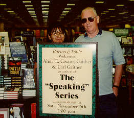 We had our first book signing on Saturday, November 6 1999 at a Barnes and Nobles in Austin. The following two pictures show us at our display and if you look real close you can find Alma behind the sign.