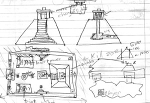 | Level design isn't any different. Everyone who's played a multiplayer game is sure to have at least thought of some way to improve a level. It all starts with an idea. For me the next step is to make a sketch. Then brain storm about all the possible ideas that I could link to the main theme. I've found that it's best to do so, or else the possibilities are endless when we site down in front of a computer. We might start out with an Aztec temple and finish with a urban lanscape. | ![]() |