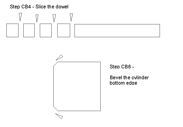 - For each 3/4" cylinder: Use the sandpaper and/or grinder to clean the edges of the cuts so there are no splinters or projecting fibers. On the end of the cylinder OPPOSITE the center mark, sand or grind the edge into a slight bevel. (A SLIGHT bevel; 1/16" is plenty.) The beveled edge is the BOTTOM of the cylinder. Figure