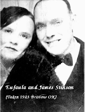 JAMES HARVEY STINSON was born on 2 Feb 1898 in FAY OK. Died on 22 Aug 1968 in NEW MEXICO. He married EUFAULA LEWIS. EUFAULA LEWIS was born on 14 Feb 1906 in SEMINOLE OK. Died on 19 Jun 1969 in NEW MEXICO. Father: HENRY WALKER LEWIS b. 16 May 1862 TN-d: Oct 27/1936 Seminole OK Mother:MINNIE ELIZABETH PRICE b: March 6, 1875 Bee Bee AR d: Feb 11, 1953 Seminole OK m: Dec 25, 1890 AR.They had the following children: i. NORMA FAYE STINSON ii. WANDA JUNE STINSON iii. BILLIE DARLENE STINSON