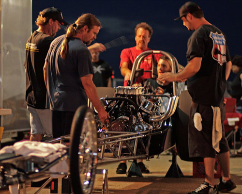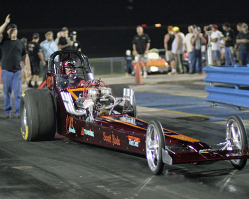 Mike Millsap drew the bye run in the odd numbered field and advanced with another 4.96 pass at 139 mph in the Sachse Rod Shop dragster. Richard Brady wheeled out the MalloryPrints.com machine against Don Scott in his beautiful new Scott’s Rods rail. Brady’s 4.89 at 141 mph got the nod over Scott’s 5.11 at 127 mph.