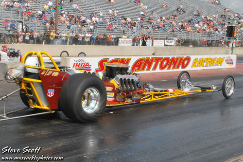 Odie Coker and Mike Millsap followed in the final pair of the first round. Millsap had a slight advantage off the line in the “Sachse Rod Shop” dragster but Coker’s horses were charging hard and took the win with a 7.58 at 180 mph to Millsap’s 7.76 at 168 mph. Ken Hawkins was the only car in the top five in points that advanced past first round as the teams headed back to the pits to find more ponies.