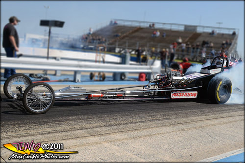 2010 SWJFA Champion Richard Brady and second year shoe Brian Briggs also laid down passes in the 5.20 zone. Ricky Marshall laid down a 5.16 at 139 mph on his opening pass to claim a spot in the top half of the field and Ron Muncy clicked off a 5.15 at 134 mph in the “Foolish Pleasure II” slingshot which held up for second quickest of the session. Shreveport runner-up Scott Parks lit the boards with a 5.00 at 117 mph in the “Walden Power Equipment” dragster and lead the field into the final qualifying session.