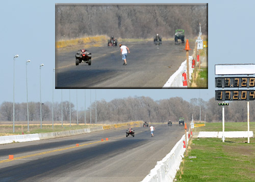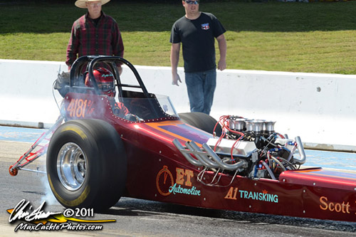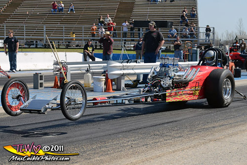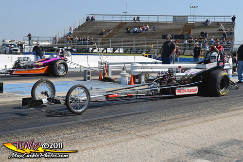Scott Parks stole the show with a jaw dropping pass that set new elapsed time and mile per hour records for the series. Parks’ 7.31 at 185 mph pass easily took the number one qualifying position with a tenth and a half on the field heading into eliminations. Defending series Champion Richard Brady blasted to a strong 7.63 at 175 mph in his final qualifying attempt, claiming the number three spot in a new chassis for 2011. After two completed sessions Ross Laird and Ricky Marshall also occupied a spot in the top half as the teams returned to the pits to prepare for a tricky first round of eliminations.