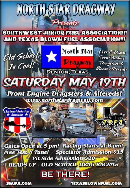 The Southwest Junior Fuel Association held their fourth event of the season on August 4th at North Star Dragway in Denton, Texas. Eleven cars came to battle down the eighth mile on a steamy summer night under the lights. Ricky Marshall entered the event undefeated after three events with three top qualifying efforts and a commanding points lead. As the sun began to set across the Texas skyline the call went out to bring em’ to the lanes for the first qualifying session.