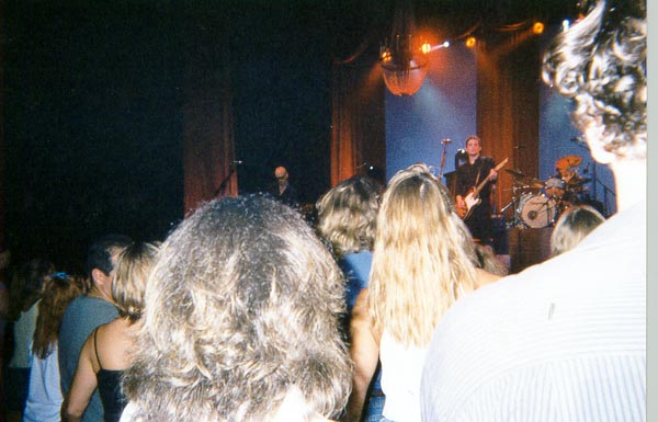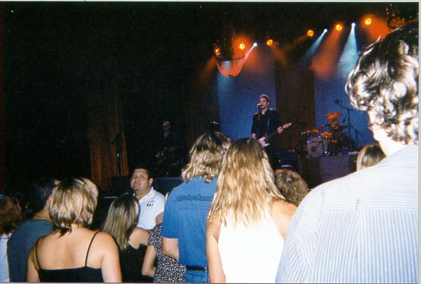 About 3 hours later, my roommate and I were headed to the concert. Well, not to the concert yet ... first we were headed to Maggie Mae's on 6th St. to the pre-concert party held by Mix 94.7. It was fun - had a $.94 margarita, and they were giving away prizes. One of them was a Wallflowers poster that I really wanted. It was a poster of a photograph from the album sleeve - the one with Michael's head taking up half the photo. I didn't win it though. About 30 minutes later, we headed toward the center. I was stopped at the front door though. The ticketperson wouldn't let me bring in the big sign I made! What?? Argh! They did let me bring in my camera though. Oh well. We headed towards our seats. The opening band was already playing. They were all right. The only thing I remember is that their bass player had the head-bopping thing going. LOL - he was even worse than Greg! After the opening band finished, Adam Duritz came onstage to make a "public service announcement" about one of the booths outside. LOL - you can tell I was paying attention. Actually, I was too busy trying to get a picture of him. I checked my watch - I was worried that my other roommate wasn't going to make it in time to see the Wallflowers. She was stuck in band rehearsal that night. (I knew there was some "higher" reason that I decided to quit band my senior year). Turns out, she ended up missing the entire Wallflowers set. They started soon after that. It was great! I was so awestruck, seeing them for the first time. The crowd wasn't too into it though. They really only stood up for the hits, and Jakob kept asking the audience if we were tired. I kept running up to the front aisle to take pics, all the time trying to avoid the ushers. They played for only about 50 minutes. Sorry, but I don't remember much about it - it's kind of all one big haze. One thing I do remember is that when Jake was introducing Greg, he said "And on bass ..." and then I screamed really loud, and Jakob goes "yeah, I quite agree. On bass - Greg Richling!". After they ended with "The Difference", the came back for an encore, and played "Invisible City" and "The Night They Drove Old Dixie Down". Jakob wore a hat for the occasion. After that, the Counting Crows came on stage and played for about 2 hours. They were great - better than I expected. My roommate had made it to the concert by then, so she caught all of the CC's set. She was EXTREMELY disappointed that she missed the Wallflowers though. I felt really bad for her.