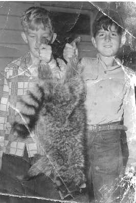 This Is A Picture Of Me And My Cousin. We Were The Big Game Hunters. We Had Been Hunting All Night Long, And Very Tired. This Was A Record Size Coon Back Then, And We Were Featured In A Coon Hunting Magazine. I Still Had Not Combed My Hair.