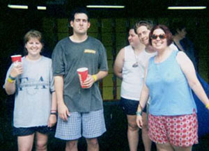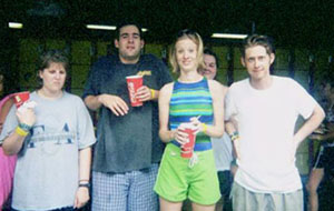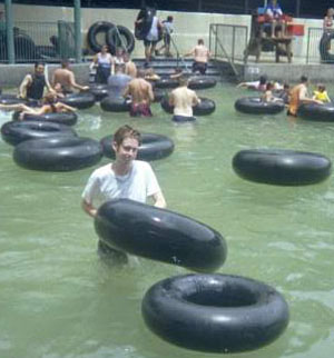 Left: "Hey, Jennifer, isn't it great how our butts keep scraping the bottom of the slide?" Right: John and Kyle pondering the possible enema effects of the next ride.